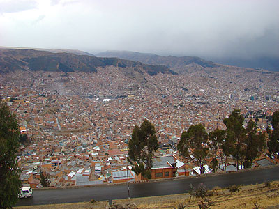 Při příjezdu do La Pazu je toto první pohled na hlavní město, který se návštěvníkům nabídne, když se přehoupnou přes okraj velkého kráteru na okraji předměstí El Alto.