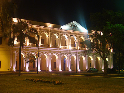 Po večeři ještě následuje noční procházka centrem Asuncionu. Některá místa jsou docela pěkně nasvícená jako například tento palác Městské rady na náměstí Nezávislosti.