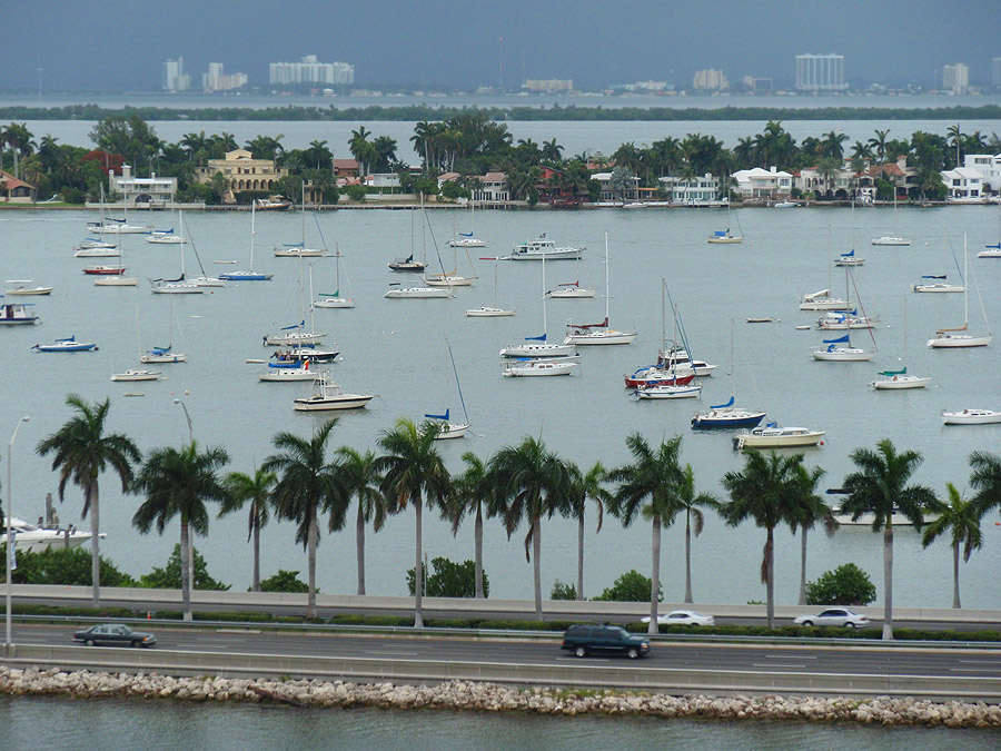 jachty mezi MacArthur Causeway a ostrovem San Marco